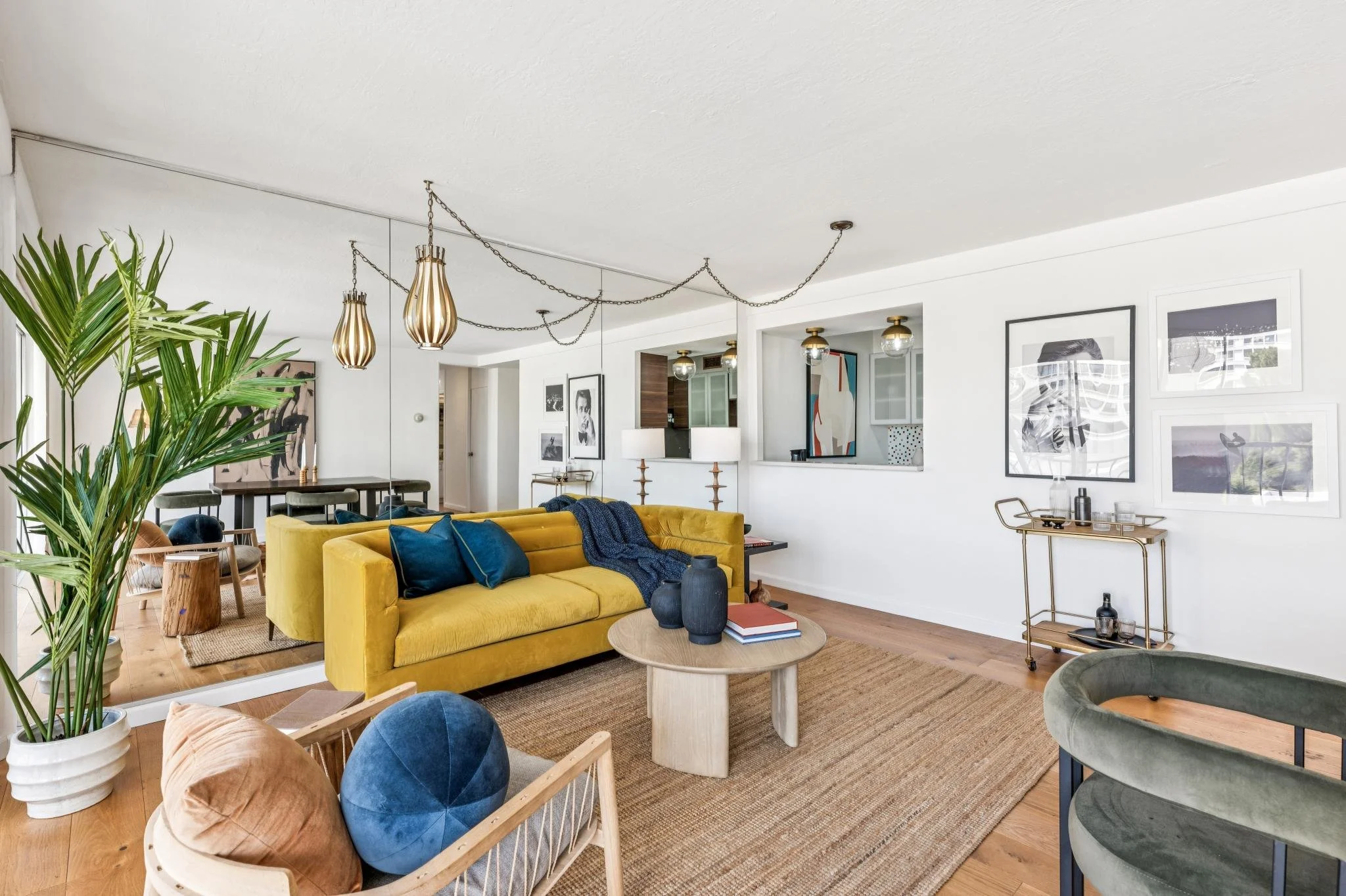 Spacious living room with yellow sofa, blue pillows, round coffee table, and wall art.