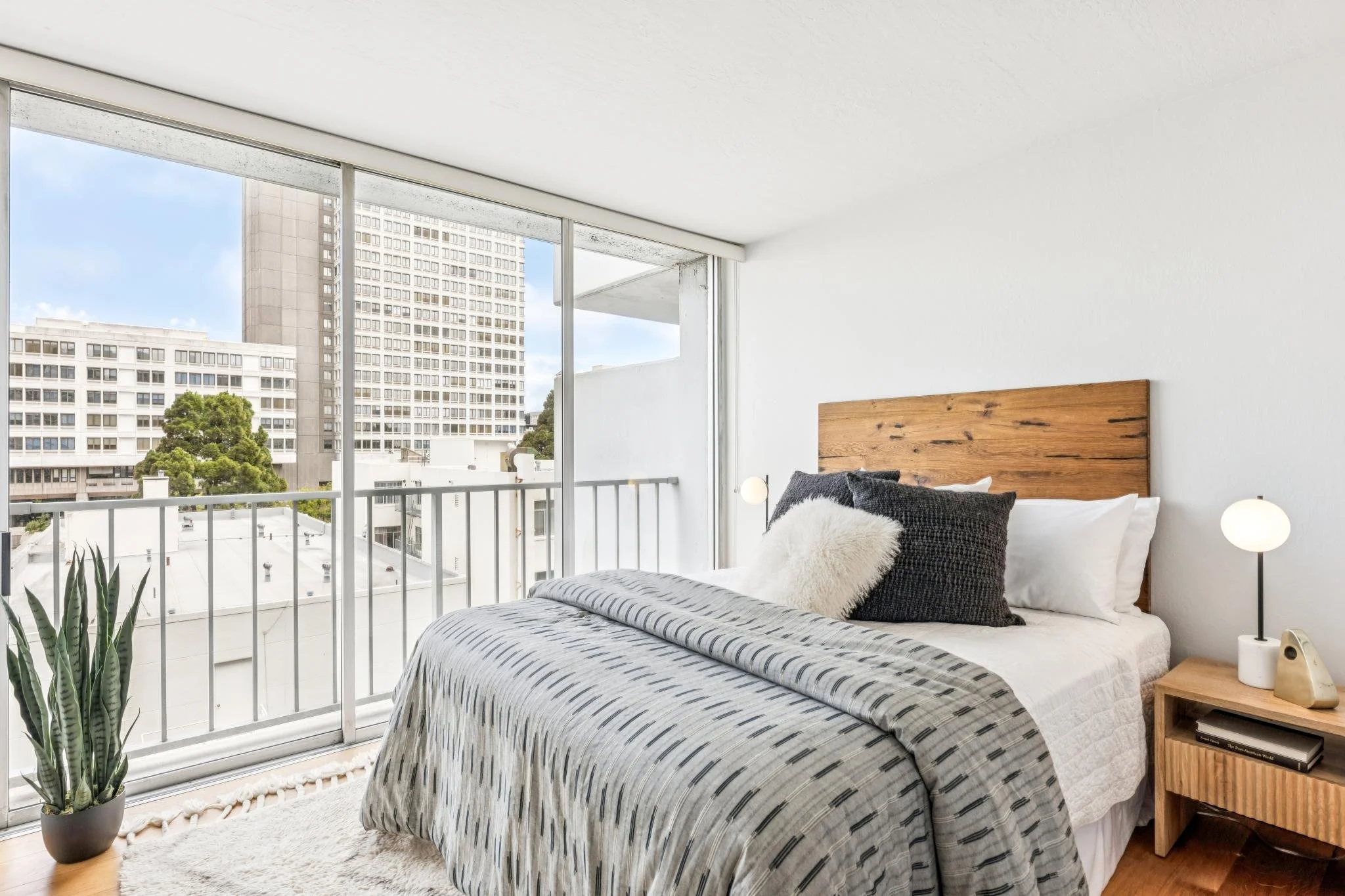 Modern bedroom with a wooden headboard, white bedding, black and white pillows, a bedside lamp, a potted plant, and a large window with a view of city buildings.