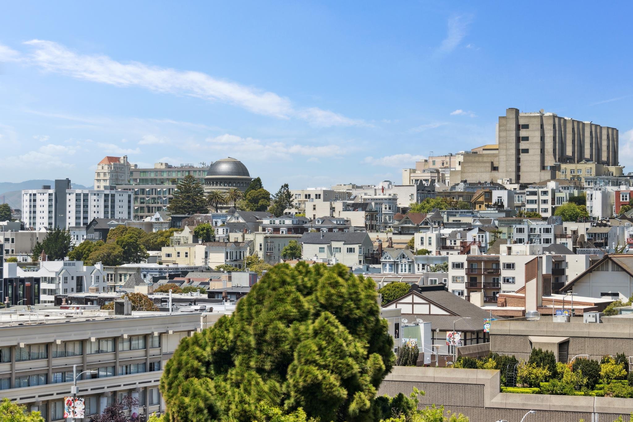 View from a bedroom balcony overlooking a cityscape with trees and tall buildings under a partly cloudy sky. View fullsize