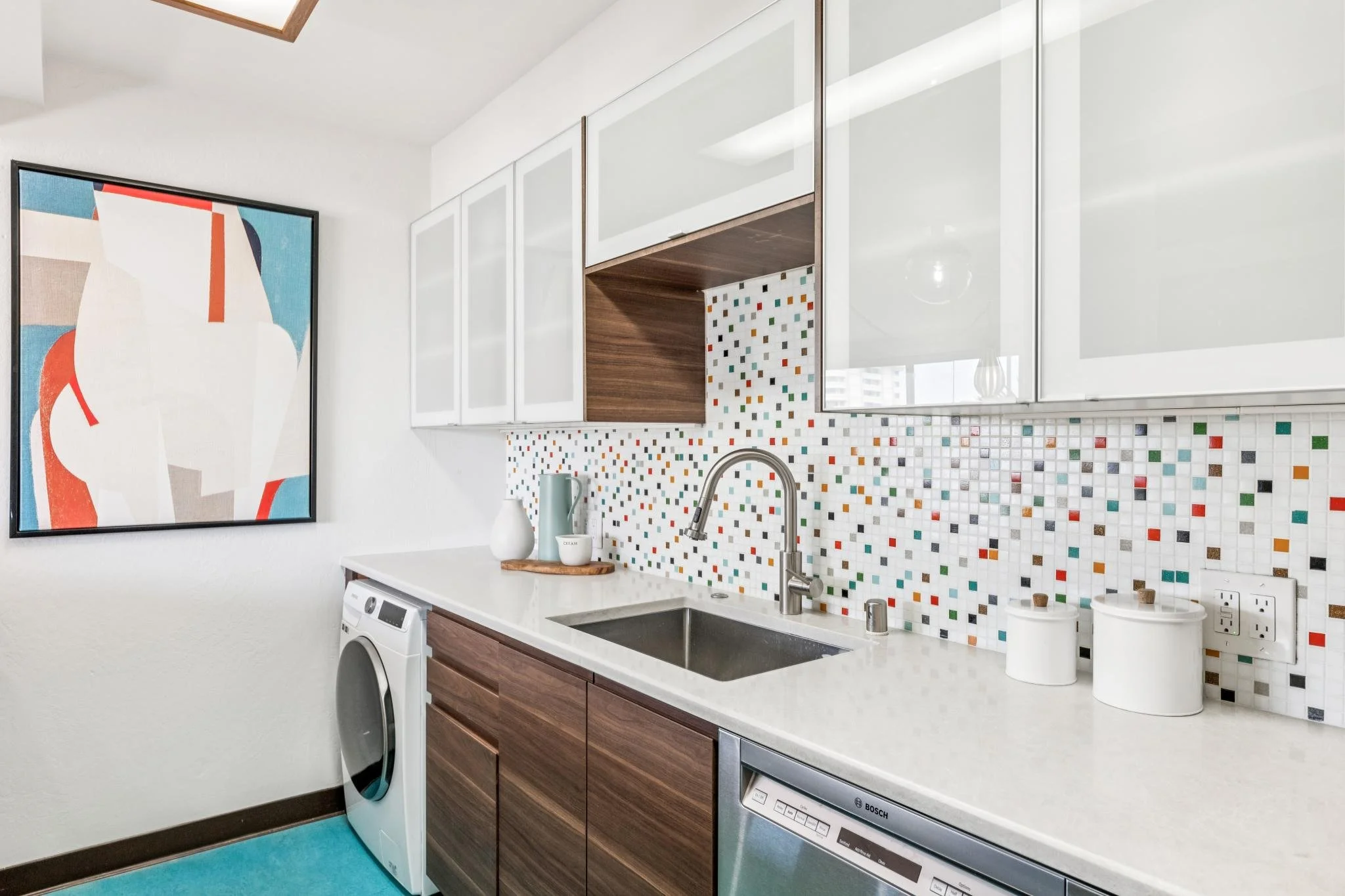 Laundry room with white upper cabinets, a mosaic tile backsplash in various colors, a stainless steel sink, and a washing machine and dishwasher.